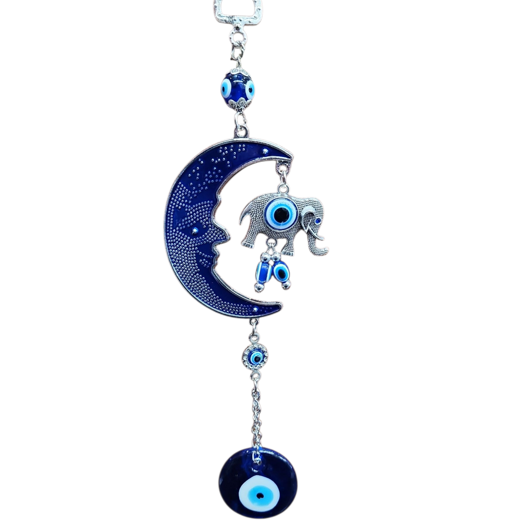 La media luna simboliza la renovación y el crecimiento, representando ciclos naturales y la constante evolución de la vida. El ojo turco, conocido también como nazar, es un poderoso amuleto de protección que aleja el mal de ojo y las energías negativas. El elefante es un símbolo de buena suerte, prosperidad, fuerza, sabiduría, longevidad y lealtad