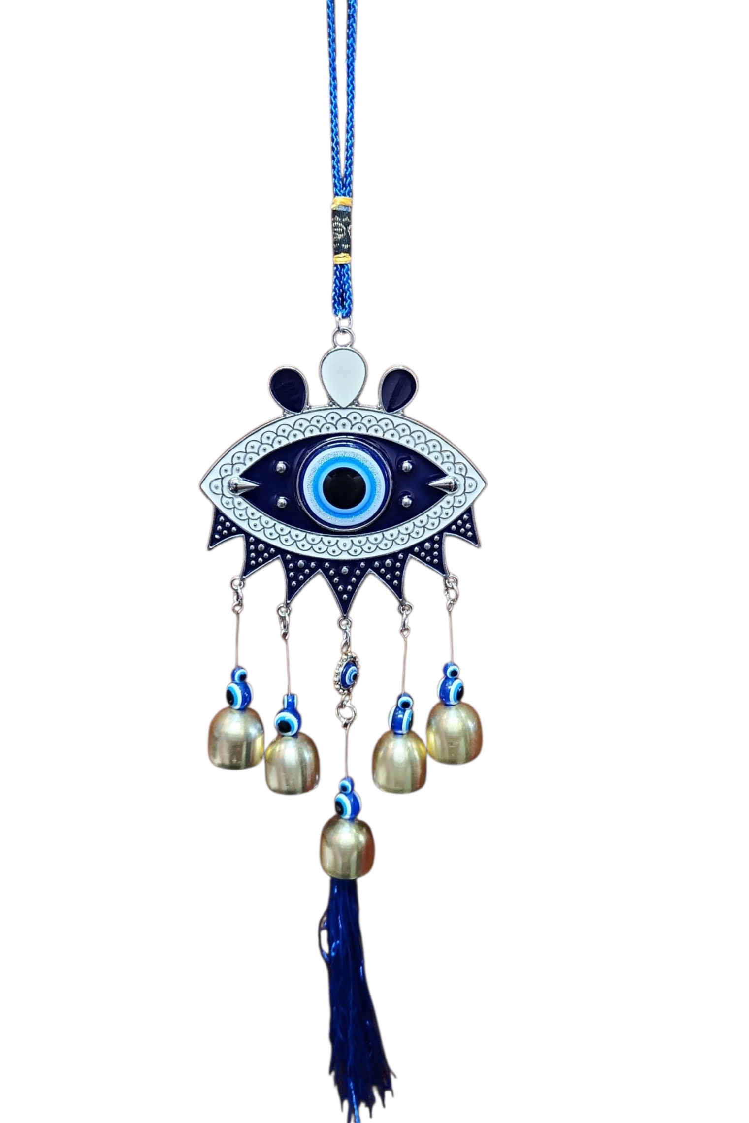 El ojo turco con campanas es un amuleto que combina la protección del ojo turco contra el mal de ojo con el sonido relajante de las campanas. Este amuleto se considera que atrae buena suerte, aleja las energías negativas y aporta armonía a quien lo posee.