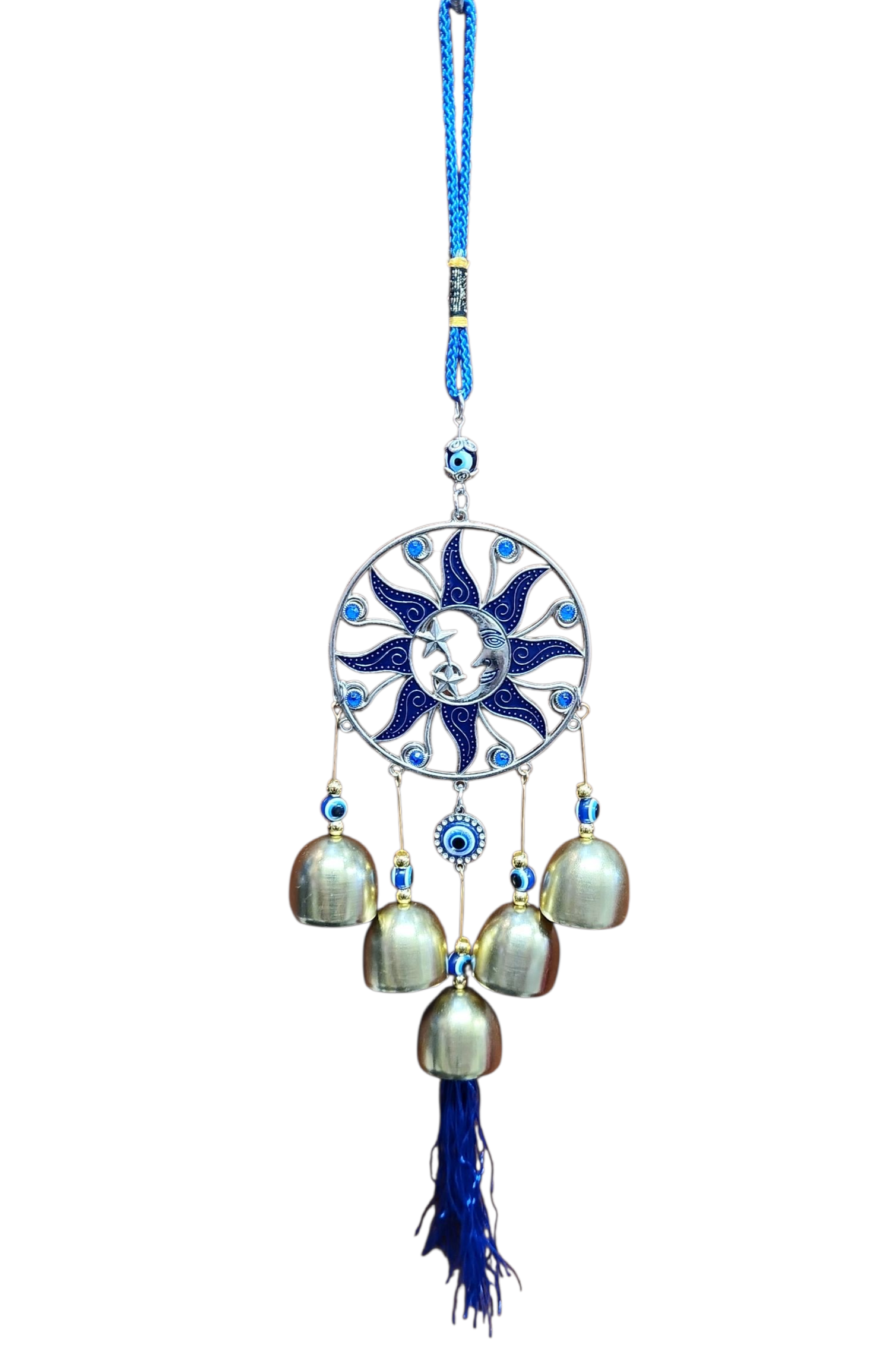 El ojo turco con un sol y campanas, como amuleto, combina la protección contra el mal de ojo del ojo turco con la energía vital y la buena suerte del sol, además de la capacidad de las campanas para ahuyentar energías negativas y atraer vibraciones positivas.